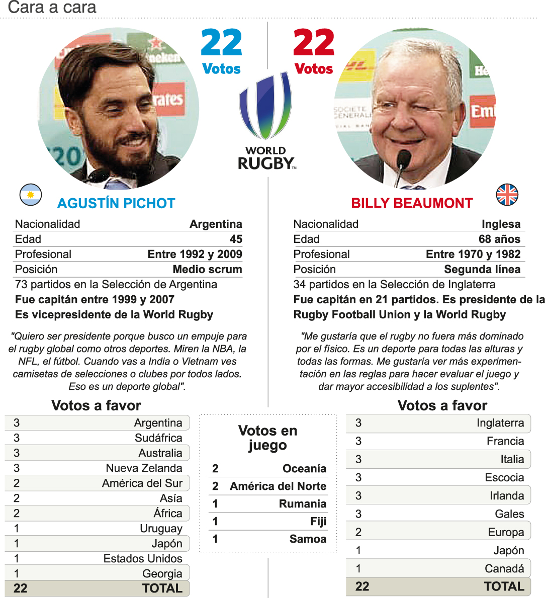 ¿Revolución o status quo? Esa antinomia representan los dos candidatos a la presidencia de la WR (World Rugby) entidad que rige los destinos del deporte en el mundo desde 1995. El argentino Agustín Pichot, actual vicepresidente de la entidad, le peleará la elección al inglés Billy Beaumont, presidente vigente.