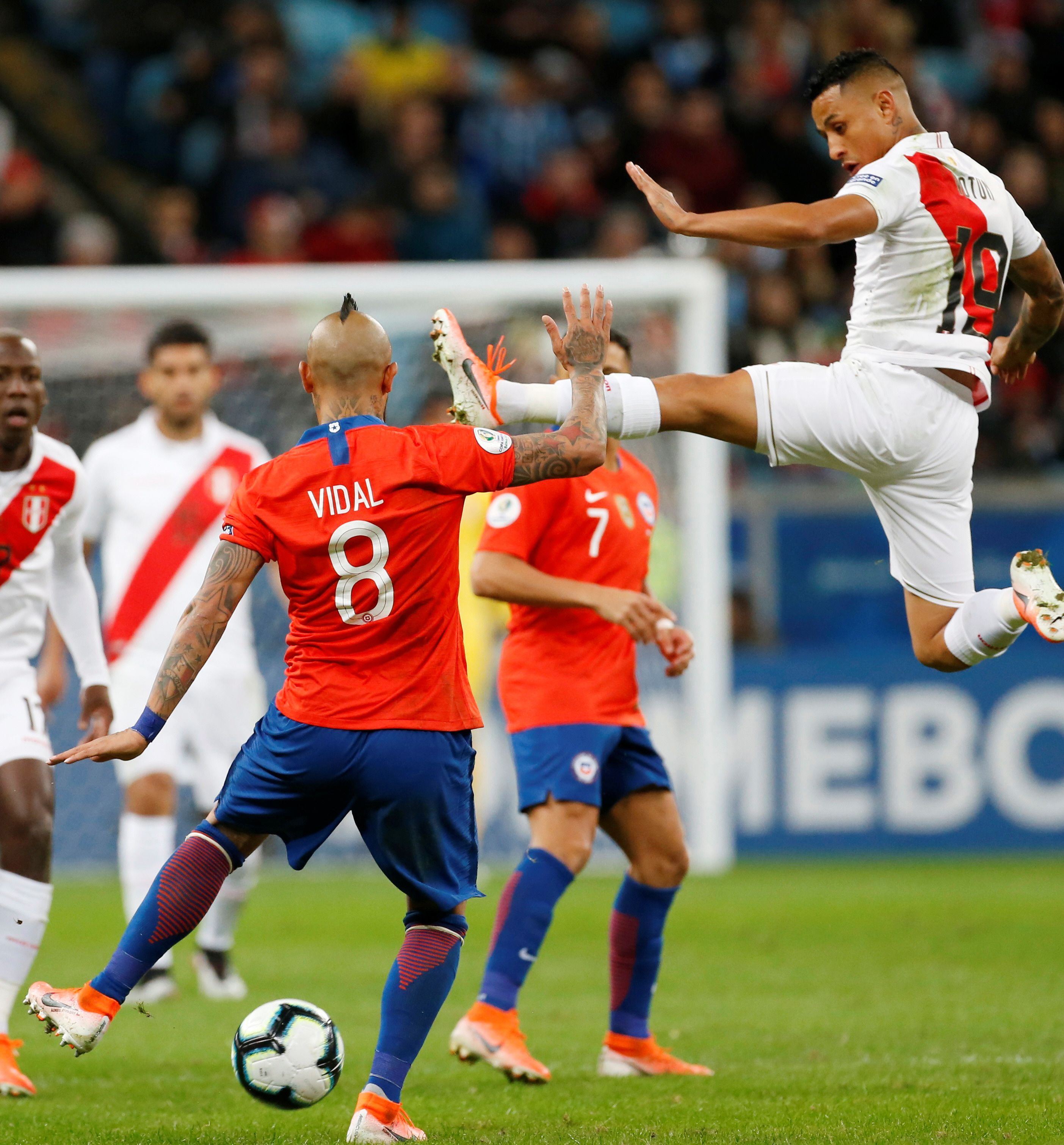 En el complemento, Chile arremetió con su dominio aunque poco pudo hacer y encima en tiempo de descuento aumentó el marcador con el tanto de su histórico goleador, Paolo Guerrero. Párrafo aparte el penal que picó Eduardo Vargas ya con el 3-0 y que desvió el arquero Pedro Gallese.