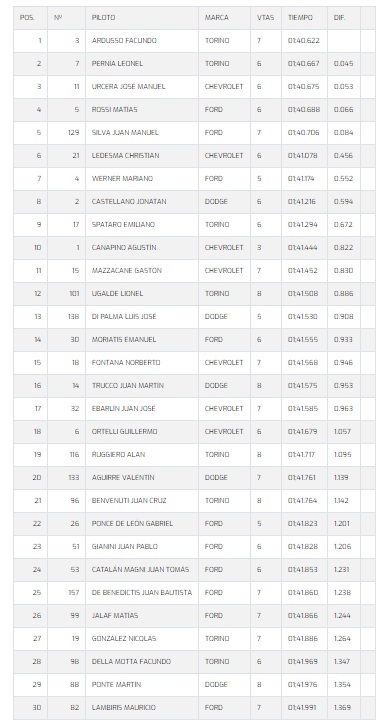La clasificación general de Turismo Carretera quedó en manos de Facundo Ardusso. El de Torino marcó un registro, en la primera tanda, de 140,622 y el domingo largará en punta la primera serie. Por su parte, el sanjuanino Facundo Della Motta largará desde la 28va posición, lejos de Ardusso.