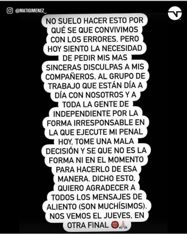 El delantero del Rojo subió una historia a su cuenta de Instagram en la que pidió disculpas tanto para sus compañeros como para los hinchas. "No suelo hacer esto porque sé que convivimos con los errores, pero hoy siento la necesidad de pedir mis más sinceras disculpas a mis compañeros, al grupo de trabajo que están día a día con nosotros y a toda la gente de Independiente por la forma irresponsable en la que ejecuté mi penal", escribió Giménez.