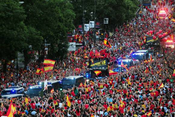 La gente le dio un colorido bárbaro, caluroso, como para ponerle la piel de gallina a los jugadores españoles. Con bandera en mano, con los colores rojo y amarillo en sus rostros, multitud de aficionados, 150 mil personas se rindieron ante los componentes de la selección española, que exhibió la copa Mundial por las calles de la capital de España un día después de coronarse campeones en Sudáfrica tras vencer en la final a Holanda.