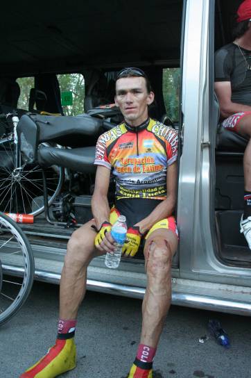 En las inmediaciones del cementerio de Pocito, cuando 60 pedaleros habían apretado el ritmo para tratar de alcanzar a Ariel Valdéz, un baldazo de agua -arrojado por un aficionado- produjo una rodada. Varios fueron los afectados y algunos se bajaron, como Emanuel Saldaño, que sufrió un fuerte golpe en los cuádriceps y se endureció. "No venía bien y preferí no arriesgar teniendo en cuenta que viene la Vuelta", contó. Otros siguieron, tal cual ocurrió con Luciano Montivero . El popular "Pato" terminó en el pelotón sufriendo el dolor de dos largos cortes en los costados de la rodilla de su pierna izquierda: "Caímos mucho y me pegué un porrazo muy fuerte, pero pude seguir soportando las molestias".