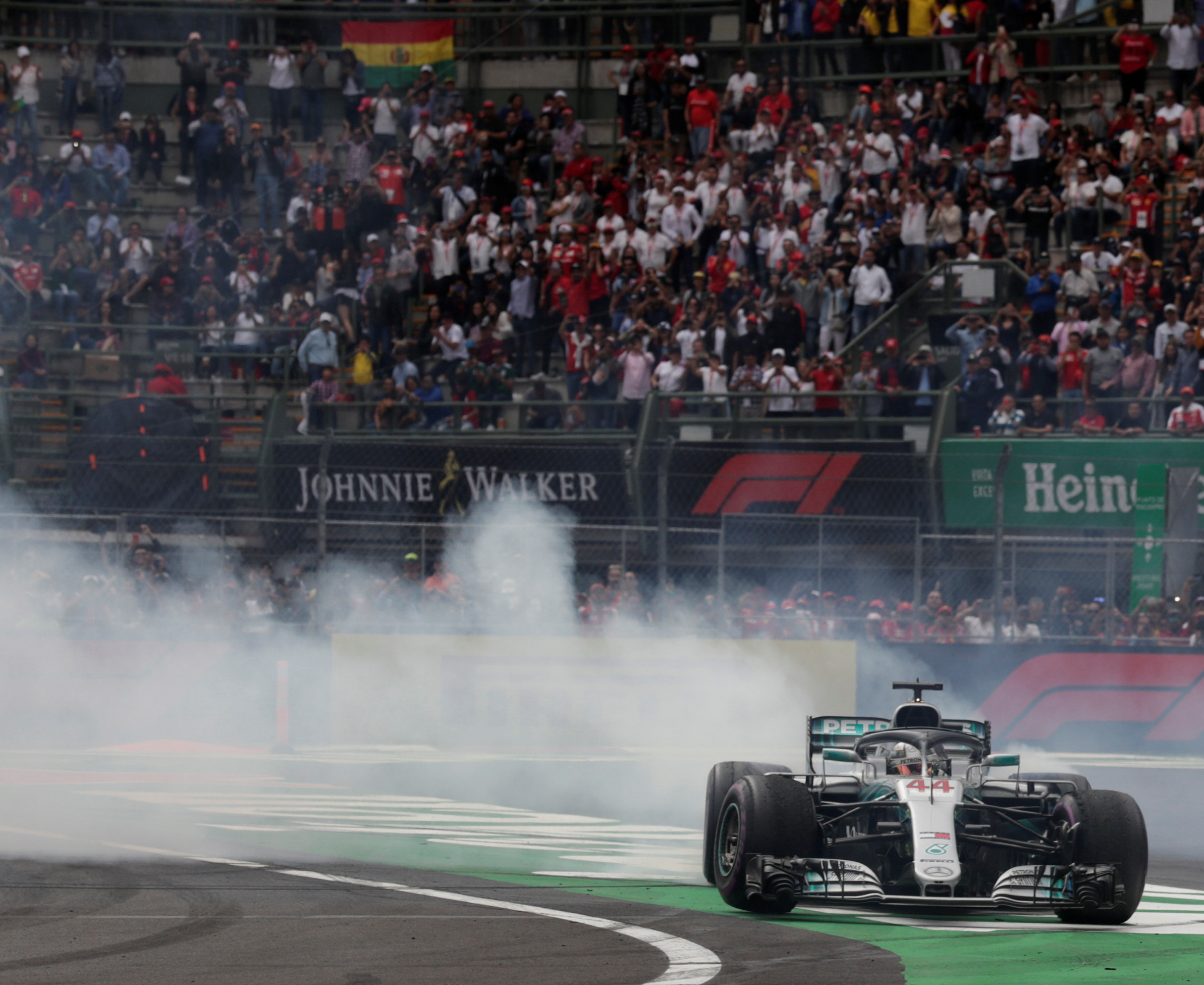Festejo. Hamilton celebró quemando neumáticos, ante el delirio de los simpatizantes mexicanos.