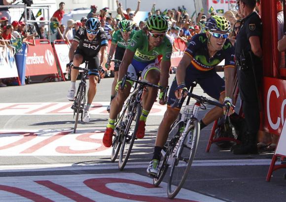 El ciclista español Alejandro Valverde (Movistar) se impuso ayer en el embalaje que definió la cuarta etapa de la Vuelta a España, disputada entre Estepona y Vejer de la Frontera sobre 209,6 kilómetros, por delante del vencedor del lunes, el eslovaco Peter Sagan (Tinkoff-Saxo), en la rampa final de la trampa que fue la meta en Vejer, un alto exigente donde los mejores dieron la talla. Valverde evitó el doblete de Sagan, que logra una nueva segunda posición en esta temporada