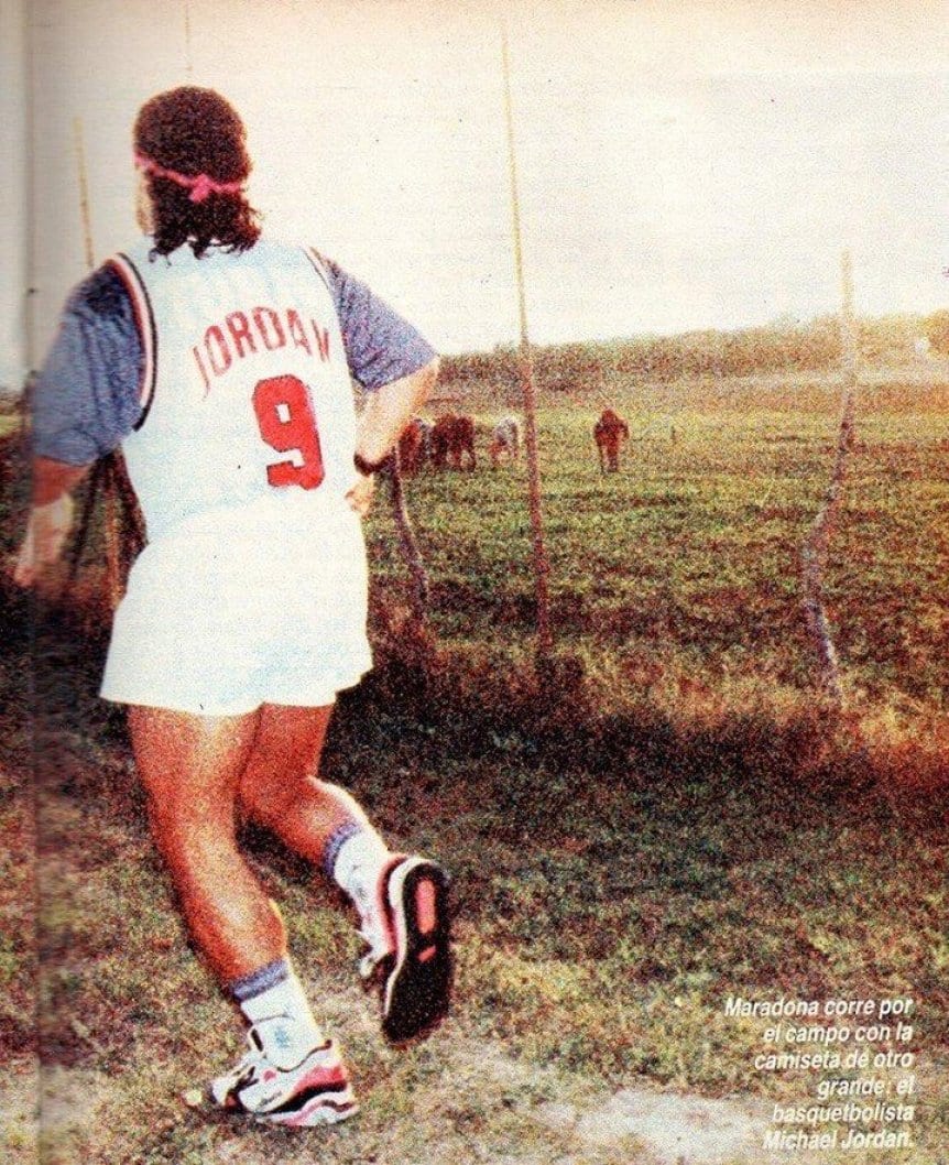 Aquella fue una de las primeras veces que Maradona habló públicamente sobre su admiración por Michael Jordan. Pero lo cierto es que al 10 siempre le gustó el básquet y el seis veces campeón de la NBA en los 90 fue una debilidad suya de toda la vida. De hecho, en aquellos históricos entrenamientos individuales que llevó a cabo en La Pampa para llegar a punto al Mundial de Estados Unidos 94, Diego se entrenaba con la camiseta 9 del Dream Team, esa que había usado MJ en los Juegos Olímpicos de Barcelona 92.
