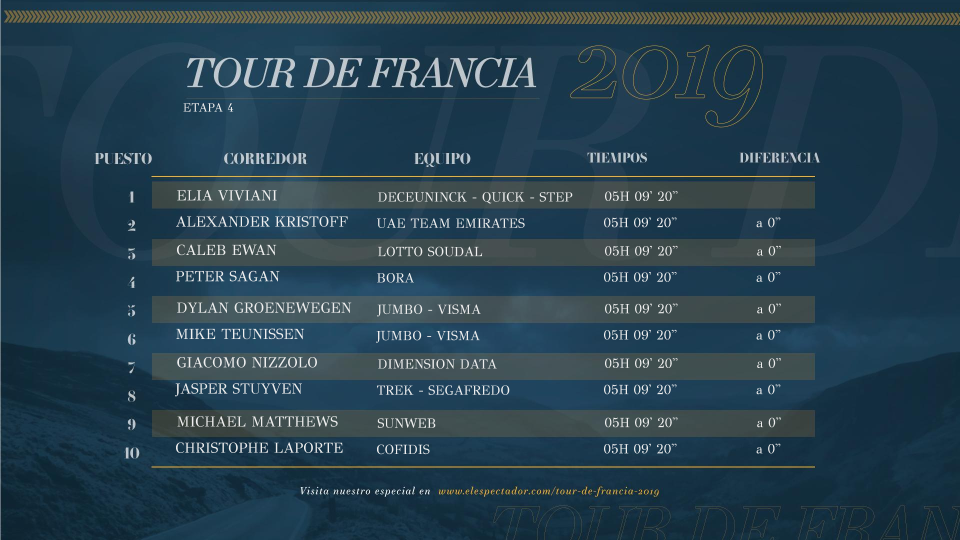 El francés Lilian Calmejane (Total Direct Energie) intentó una escapada que no prosperó. En el embalaje final se impuso el italiano Elia Viviani (Deceuninck-Quick Step). Alaphilippe conservó la camiseta amarilla de líder del Tour de Francia y buscará retenerla este miércoles en la quinta etapa, a celebrarse en 175,5 kilómetros, entre Saint-Dié-des-Vosges y Colmar.