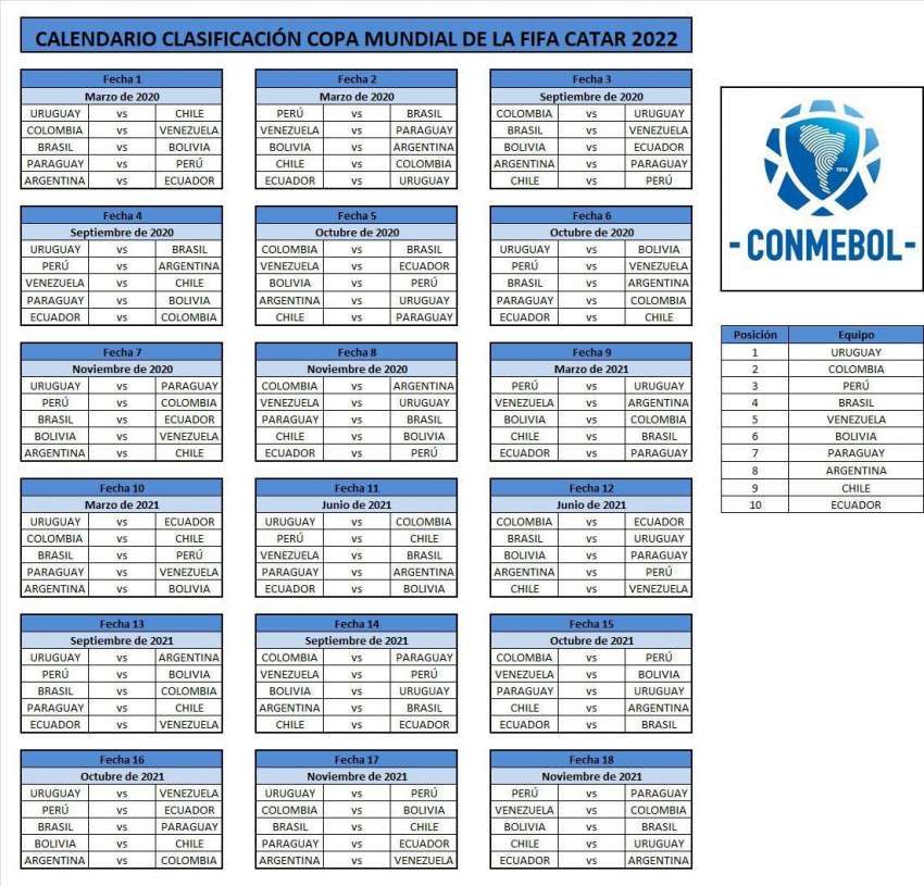 A fines de marzo comenzará el certamen y Argentina debutará contra Ecuador, en el país (jueves 26 de marzo de 2020). Y se enfrentará contra Brasil en la 6ta. y 14ta fecha.