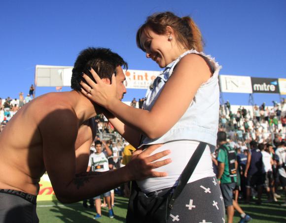 �Marcos Figueroa, autor del segundo gol verdinegro en la tarde inolvidable, apenas terminó el partido buscó a su esposa, quien está embarazada. Después del beso del jugador a la pancita de su esposa festejaron a pleno.