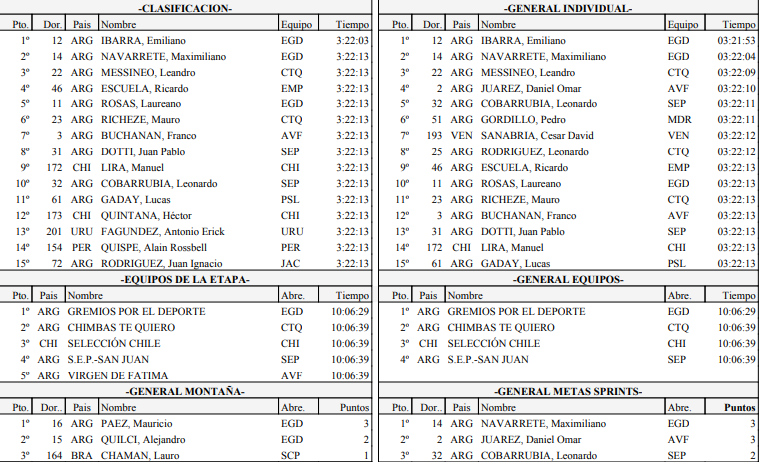 Detrás del ganador, que registró un tiempo de 3 horas, 22 minutos y 3 segundos, llegó su compañero de equipo Maximiliano Navarrete diez segundos más tarde. Mismo tiempo marcaron el tercero Leandro Messineo (Chimbas Te Quiero), el cuarto Ricardo Escuela (Municipalidad de Pocito) y otro pedalero de Gremios por el Deporte como Laureano Rosas, que quedó quinto.