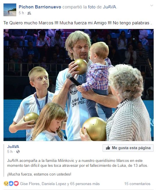 El mundo del vóley utilizó las redes sociales para expresarle su apoyo y condolencias. Uno de ellos fue el sanjuanino Fabián ‘Pichón’ Barrionuevo quien es amigo de Milinkovic y suelen verse a menudo.