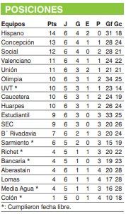 Uno de los que se le arrimó a Hispano es Concepción, que ganó y quedó a sólo un punto. El Azul le ganó con lo justo a Sarmiento por 3-2, con goles de “JJ” Marín (2) y Osvaldo Raed. Descontó Diego Olaya (2).