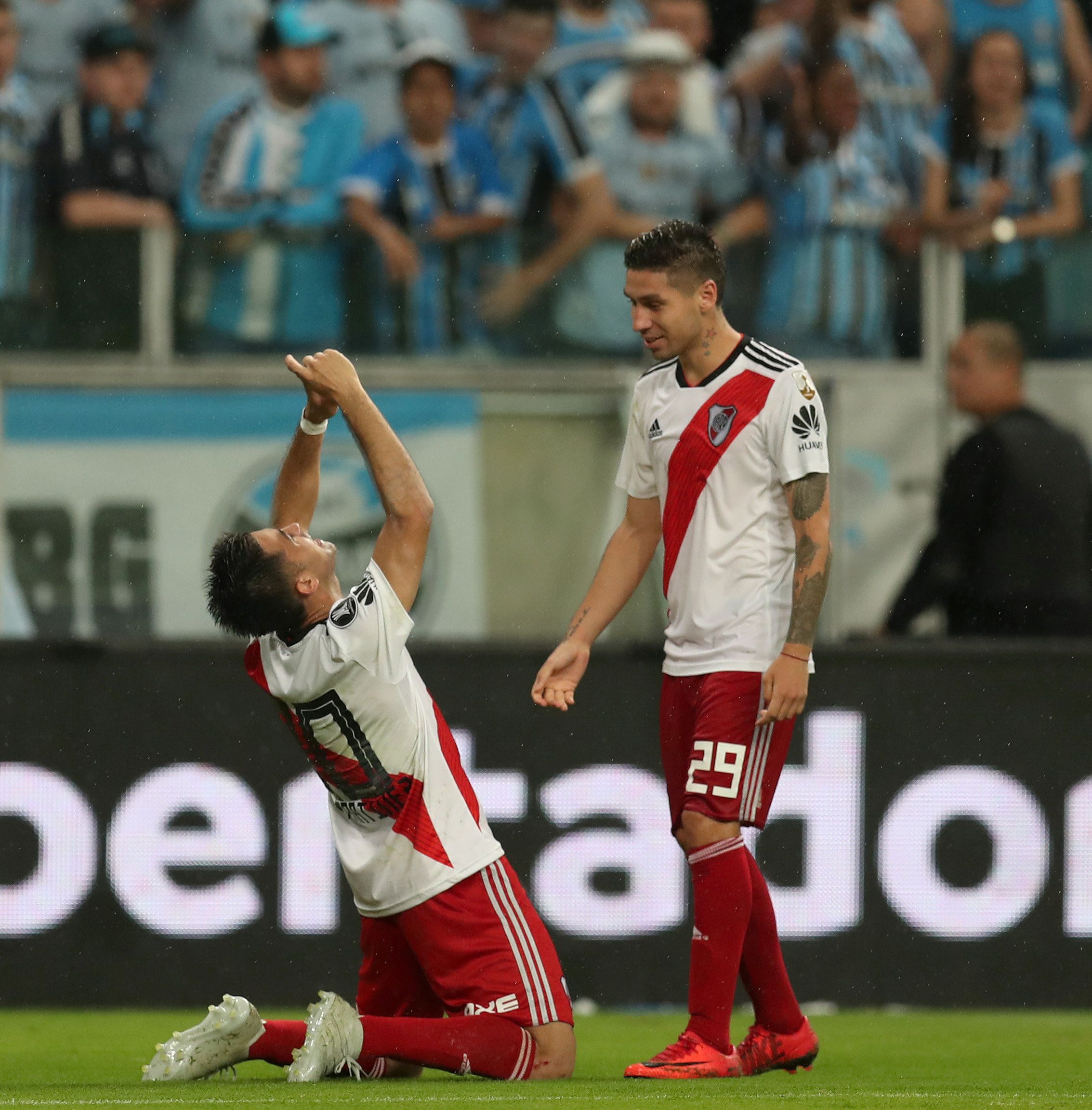 River, con Marcelo Gallardo (suspendido) observando el juego desde una platea, tuvo mayor posesión de pelota y más remates al arco, pero no pudo traducir eso en goles durante la primera parte. Cuando más atacaba River, que jugaba todo en campo del rival, Gremio abrió el marcador. Desde fuera del área y tras una pelota parada, Leo Gomes sorprendió con un remate (desviado por Pratto) que se coló bien abajo de la estirada de Armani. Así, prácticamente sin haber pasado la mitad de cancha, el local se puso en ventaja.