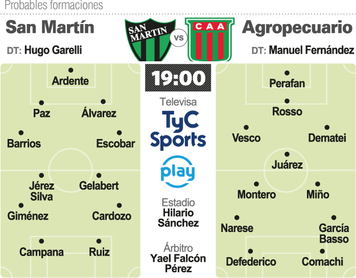 San Martín buscará que hoy sea un domingo diferente al anterior, cuando empató sin goles ante Mitre de Santiago del Estero, se fue silbado por sus hinchas y eso derivó en la salida de su entrenador Alfredo Grelak. Hugo Garelli, al mando interinamente, preparó cinco variantes para el choque de hoy, manteniendo solo la columna vertebral del equipo con Ardente, Gelabert y Jerez Silva, aunque también se mantienen Alvarez, Escobar y Ruiz. Se destaca también el ingreso del sanjuanino Matías Giménez, uno de los jugadores requeridos por los hinchas que hoy tendrá la chance de ir de arranque.