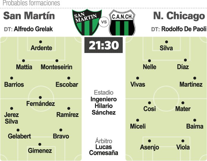 Las rachas sirven para aprovecharlas porque se potencia todo lo bueno y se disimulan los errores. San Martín está en ese proceso y después del resonante triunfo en Río Cuarto del viernes pasado que le dio más valor agregado a la anterior victoria contra Ferro, esta noche en el Pueblo Viejo irán por un tercer escalón para afirmarse ya definitivamente en zona de clasificación. El rival será Nueva Chicago, que recién ganó su primer partido en la fecha anterior, con todo lo que significa. Un rival con mucho para ganar y con poco para perder a esta altura de la temporada. En San Martín, la idea de Grelak se va afirmando. Los triunfos lo fueron sosteniendo y el nuevo modelo ya tomó cuerpo con efectividad total con dos triunfos en dos partidos. Eso ayuda en todo sentido y los nombres ya empiezan a salir de memoria, en un síntoma que respalda el trabajo semanal. Recuperado ya Juan Francisco Mattia quien no pudo jugar con Estudiantes de Río IV por una afección estomacal, la formación inicial del Verdinegro repetiría los mismos nombres que ya jugaron contra Ferro en el inicio de este miniciclo con un solo punta, tres volantes de respaldo y dos de contención más la línea de fondo. De adelante para atrás, Martín Bravo será el punta del sistema de Grelak otra vez, sabiendo que el ex-Pumas de México está lejos de ser el tradicional centrodelantero de potencia. Bravo es movilidad, juego asociado y más libertades para recostarse a los costados. En su respaldo y con más posibilidades de proyección aparece el trío que encarnan Julio Ramírez, Gelabert y Giménez. Los tres tienen vocación ofensiva, los tres llegan y los tres definen. De respaldo aparecen Jerez Silva y Fernández en un tándem que busca equilibrio, marca y recuperación en esa zona vital. Y claro, en el fondo, una clásica línea de cuatro con la zaga Mattia-Monteseirín y los laterales Barrios junto a Escobar, teniendo de referente a Ardente.