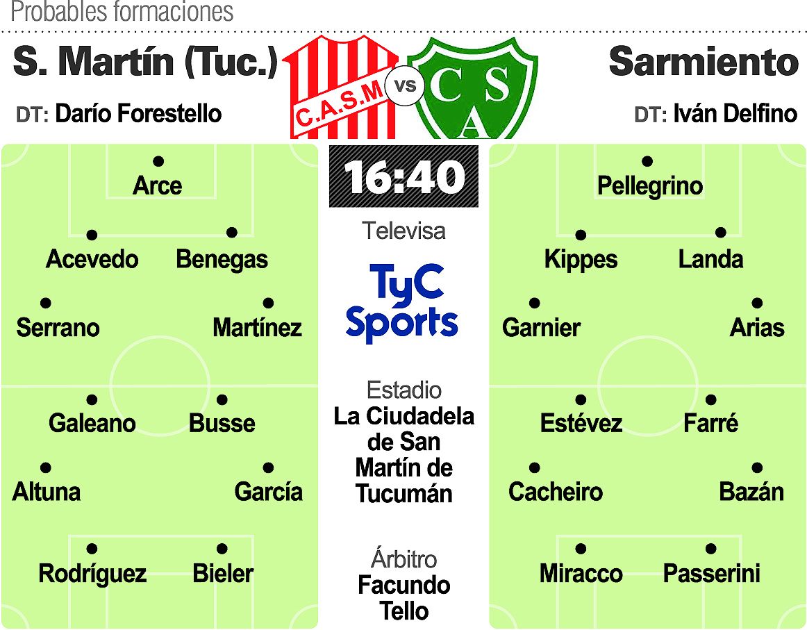 Por el lado de San Martín, Darío Forestello repetirá a los once titulares que arrancaron el partido en Junín, mientras que su colega y amigo Iván Delfino realizará un cambio ya que al lateral derecho Yamil Garnier cumplió la suspensión por cinco amarillas y reaparecerá en lugar de Javier Capelli, lesionado.