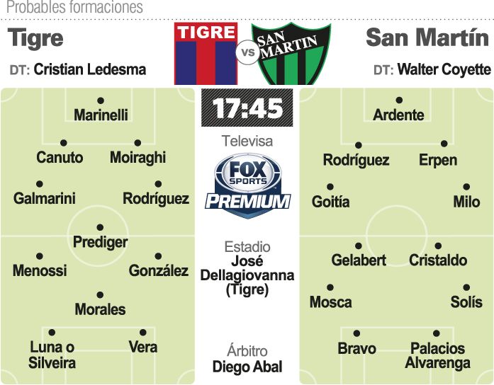 En ese choque de necesidades es donde San Martín tendrá que sacar ventajas. Las urgencias son similares pero del lado de Tigre hay más presión. En lo futbolístico, el equipo de Ledesma llega con ausencias como la del volante Jorge Ortiz y la del delantero Federico González. Eso lo condiciona. Pero en San Martín eso poco trasciende porque lo importante pasa por lo que haga el conjunto verdinegro. Las lesiones de Alex Silva y de Gianni Rodríguez obligaron a que el entrenador disponga los ingresos que serán debut para Goitía y Federico Milo, como laterales. Pero en la defensa también habrá otro retoque porque con la recuperación de Juan Rodríguez, el que dejará la plaza vacante es Arian Pucheta. Cambios que se imponían pero en el mediocampo aparecen las sorpresas y es que Coyette sigue buscando más volumen de juego y lo que le dieron Franco Cristaldo y Nazareno Solís con sus ingresos en el segundo tiempo ante Patronato, sobró para que ahora les dé titularidad. Cristaldo irá por Matías Sánchez y Solís jugará en el lugar de Diego Cardozo. Los que no salen son Gelabert y Claudio Mosca. En tanto que en el ataque la fórmula vuelve a ser Bravo-Palacios Alvarenga. Para San Martín, el arranque de la Superliga no ha sido sencillo. Se cruzó con rivales directos por la permanencia y esta tarde, en Victoria, el objetivo vuelve a ser sumar, triple en el mejor de los casos, y consolidar una propuesta que le permita trabajar tranquilo.