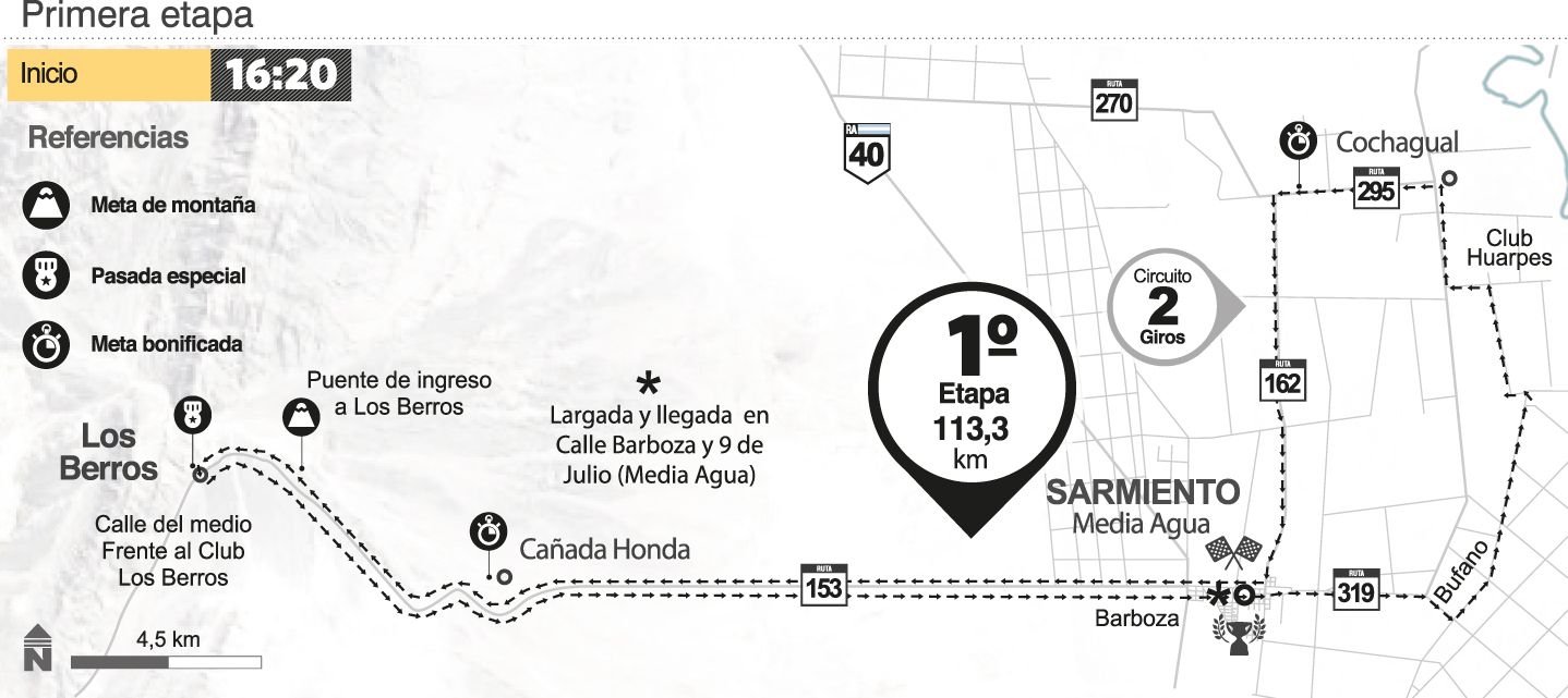 La prueba se pondrá en marcha a las 16,30 desde la plaza de Media Agua, desde allí partirá el numeroso pelotón rumbo a Cochagual y luego de dejar ese distrito se moverán buscando Los Berros donde llegará la primera meta de montaña a disputarse justo en el puente de ingreso. El pelotón retornará, y en Cañada Honda se realizará la primera meta volante que será clave para descontar unos segundos cuando ya hayan transcurrido 70 kms. A los 30 kilómetros después se disputará la segunda meta volante y ya desde allí nuevamente en la villa cabecera de Media Agua se definirá al ganador.