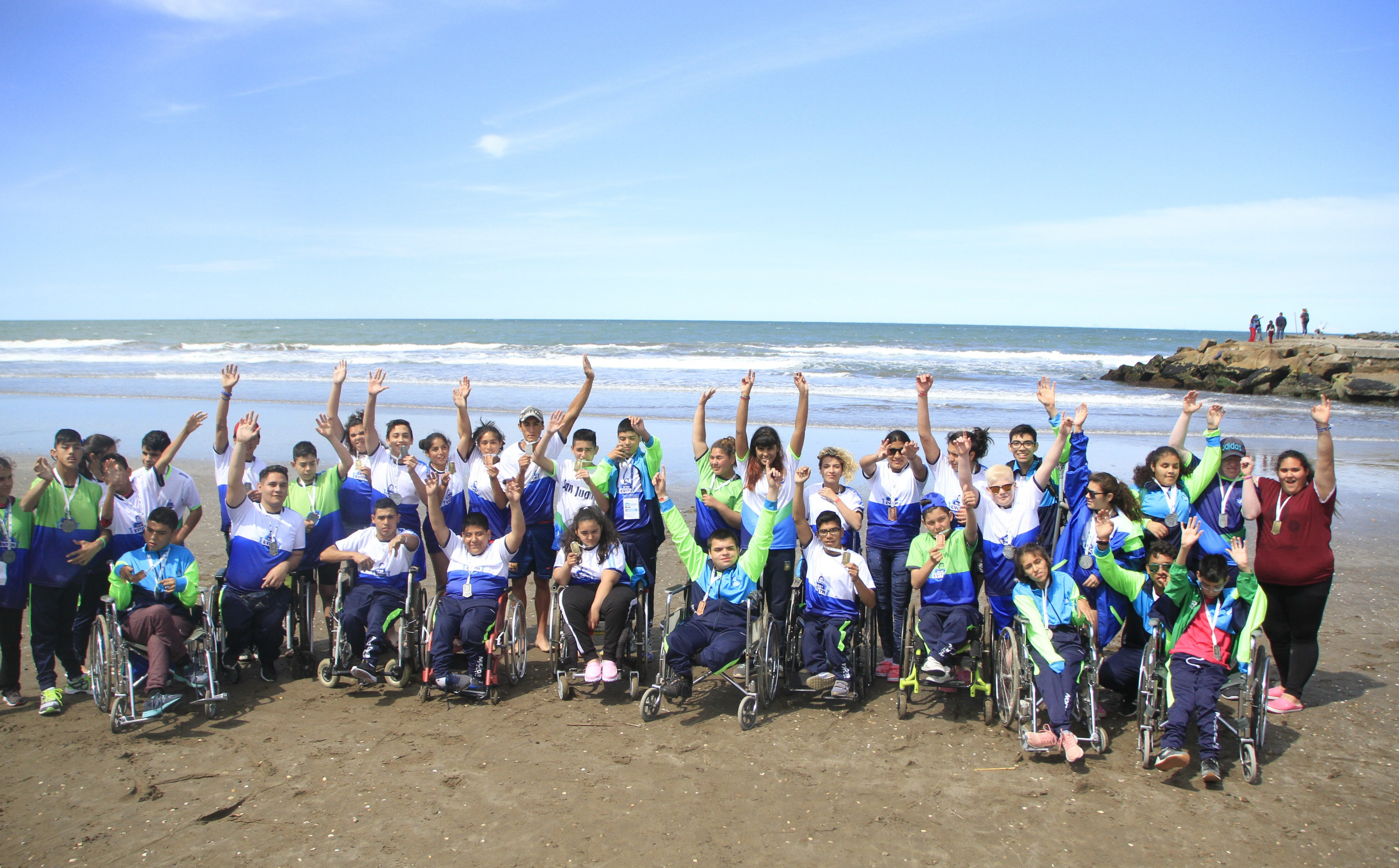 La despedida. Juntos, atletas que participaron de las disciplinas adaptadas con algunos de los chicos de distintos deportes que lograron un meritorio noveno lugar en el medallero general, comparten la última jornada en las playas marplatenses.