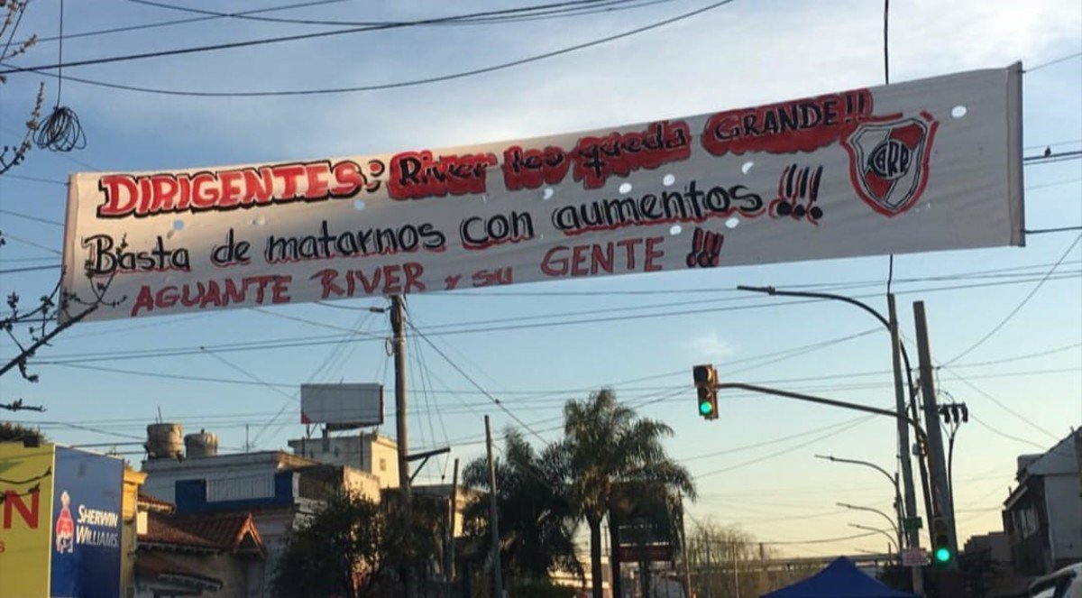 "Dirigentes, River les queda grande. Basta de matarnos con aumentos", rezaba uno de los pasacalles que sorprendieron a los vecinos de Lanús. "Aunque no les guste a los dirigentes, siempre vamos a estar", se podía leer en otro de los carteles colgados cerca de la Fortaleza.