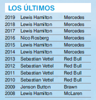"Presioné todo lo que pude con la esperanza de ganar, pero lamentablemente no lo logré", señaló, insaciable, el nuevo campeón. Los anteriores títulos conseguidos por Hamilton fueron en el 2012 con la escudería de McLaren, y los otros cinco (2014, 2015, 2016 y 2017) con Mercedes.