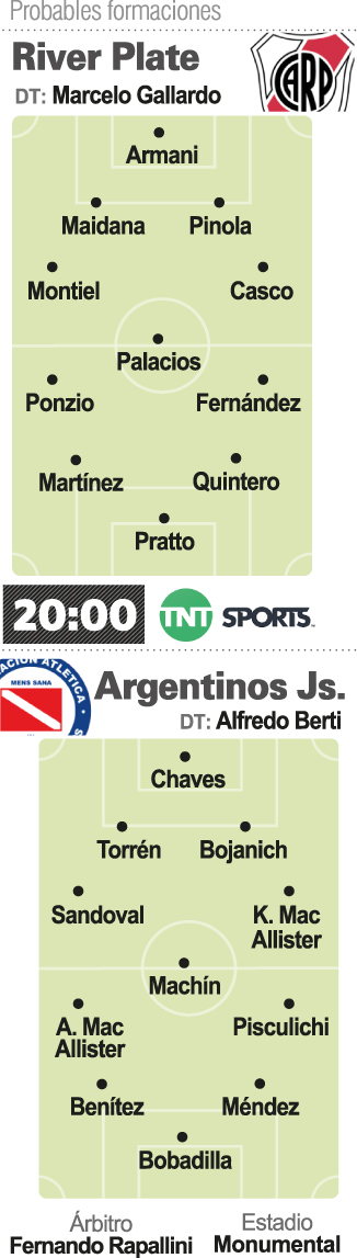 Con los ecos de protestas, recursos y reclamos en el medio, River Plate irá hoy por una victoria desde las 20,15 cuando reciba a Argentinos Juniors en el Monumental. En el juego de contrastes, los 22 partidos sin derrotas que acumula River desentonan con la serie de tres empates 0 a 0 que elevan la sequía de goles a 301 minutos. Con la mente puesta en el partido del próximo sábado, a las 20.15 contra Argentinos Juniors, Marcelo Gallardo es consciente de la necesidad de recuperar la contundencia ofensiva a días del trascendental partido con Racing. Sin embargo, entiende que el presente de su equipo está por encima de las rachas. Y no duda en el plan para enfrentar al Bicho: "No voy a guardar nada de cara al partido de Copa".