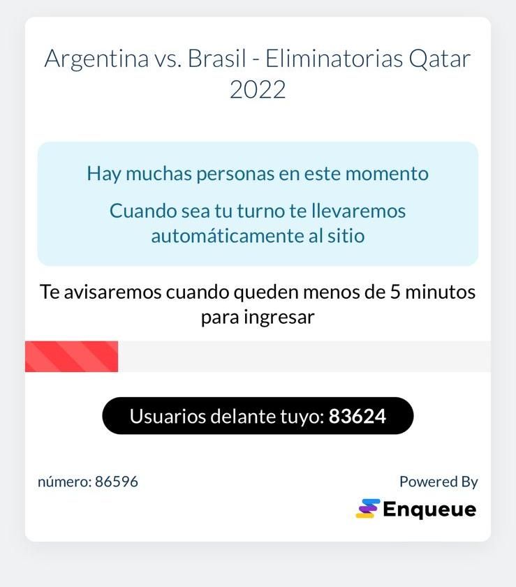 Según informaba el sitio autoentrada.com a quienes intentaban adquirir una localidad, a las 9:25 había "0 entradas disponibles". Mientras que, en ese momento, había además más de 80.000 personas en la fila virtual para conseguir un lugar.