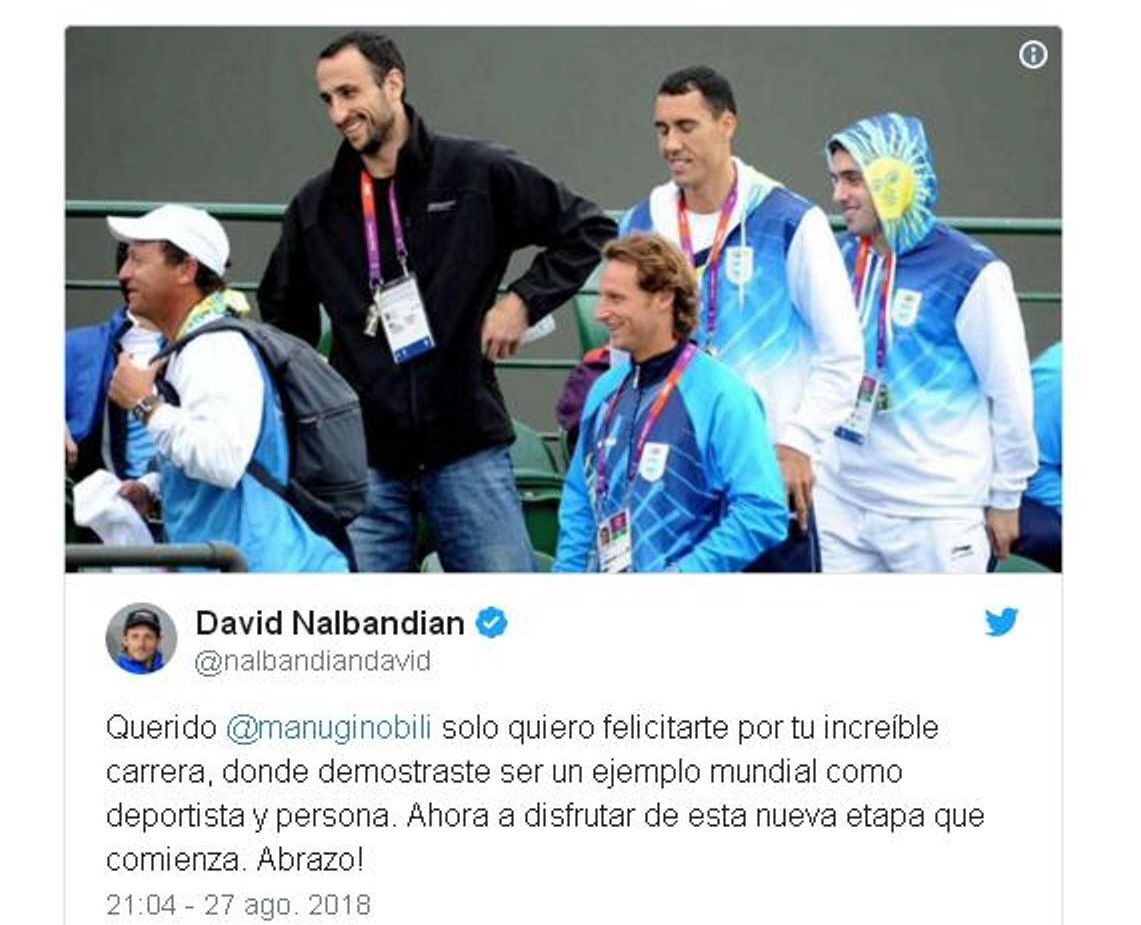 Desde personalidades de la NBA, excompañeros de la Selección argentina, hasta figuras -que al igual que él- son leyendas en sus deportes como Diego Maradona, Luciana Aymar y Agustín Pichot lo despidieron a su manera. "Lucha", quien supo brillar con Las Leonas en hockey sobre césped, escribió: "Imagino lo que habrá sido tomar una decisión tan difícil como ésta. Dar más de lo que diste es imposible, enorme como pocos. Respeto, perseverancia y pasión fueron algunos de tus valores más fuertes. Gracias por tanto Manu". El Diego, quien ya lo había elogiado en su programa "La noche del Diez" allá a mediados de la primera década del 2000, le escribió: "Sos un orgullo nacional", acompañado de una foto del alero con laureles.