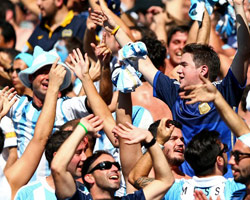 Una multitud vestida con los colores celeste y blanco le dio un ensordecedor aliento al seleccionado argentino desde las tribunas del Mineirao antes y durante el partido ante Irán.