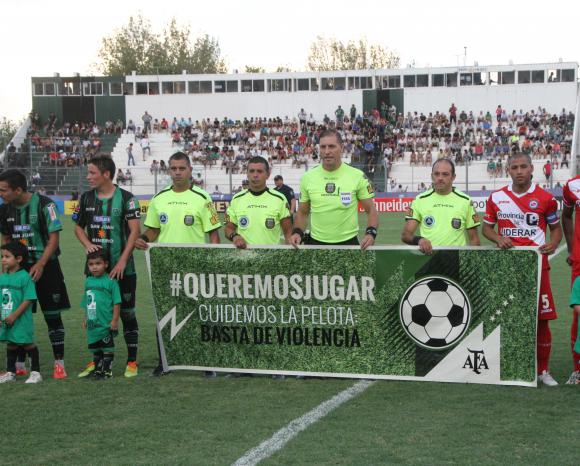 Las tribunas del “Hilario Sánchez”, que presentaron blancos en todos los costados también sufrieron por el viento pero igual alentaron. Y antes que empezara el partido, los equipos formaron para el saludo invadidos por pequeñines que mostraron la bandera de la no violencia de la AFA.