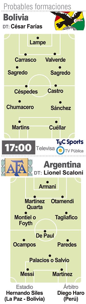 Donde al oxigeno realmente falta y también donde la pelota parece que vuela, ahí la Argentina buscará hacer pie esta tarde desde las 17 horas (TV Pública y TyC Sports). Son los 3.640 metros de altura sobre el nivel del mar de la temida La Paz, con ese escenario siempre adverso para sus visitantes que es el Hernando Siles. La selección de Lionel Scaloni visitará a Bolivia, que en su reducto, según dijo el DT albiceleste, "es una de las mejores del mundo". Exageración o no por parte del coach, lo cierto es que siempre en La Paz son partidos "especiales". De hecho, hace 15 años que Argentina no triunfa: en aquel 2-1 rumbo a "Alemania 2006" estuvo en el césped con pantalones cortos Scaloni.
