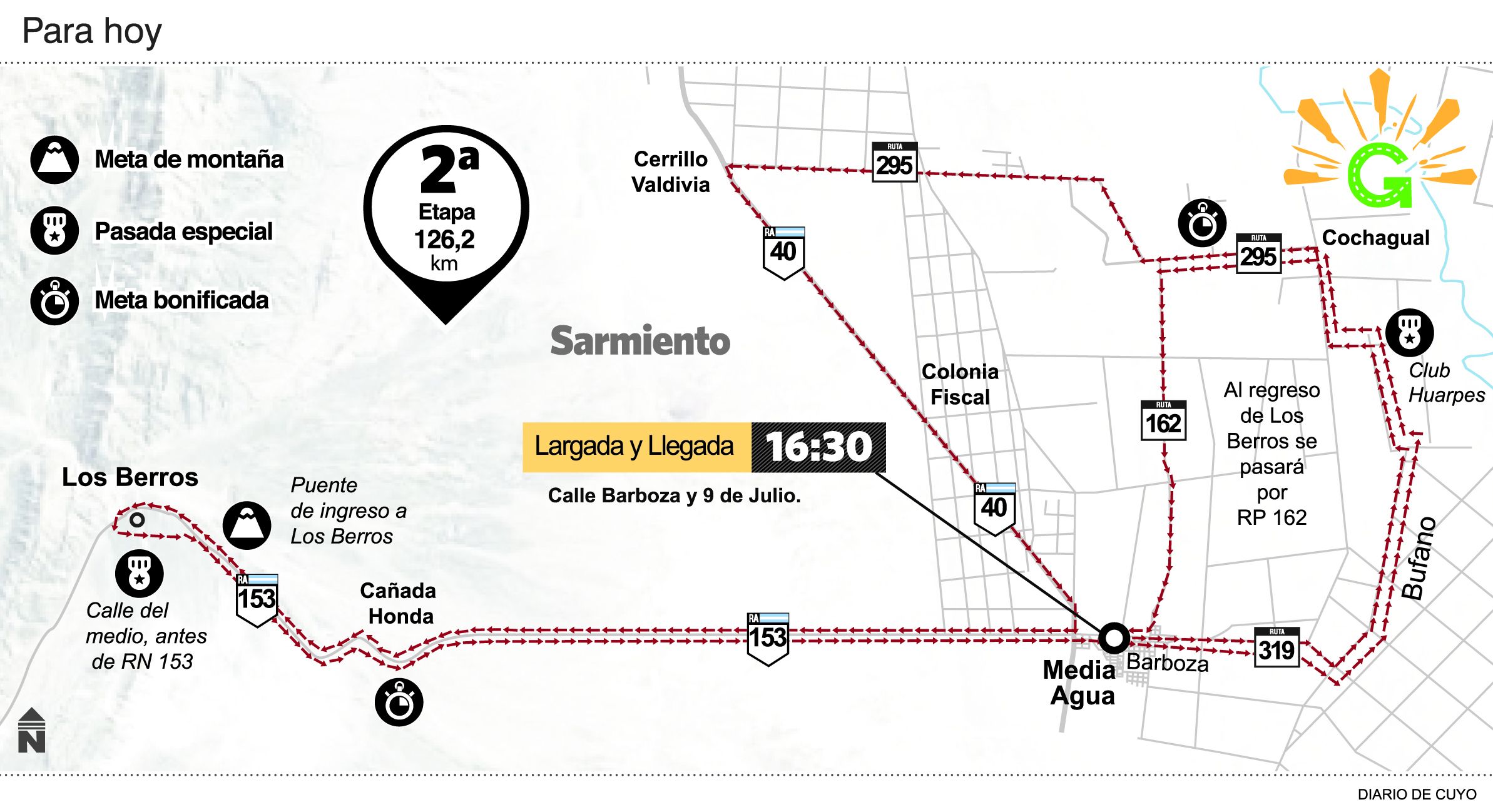 Al regreso se visitará nuevamente Cochagual, para concluir en calle Barboza, tras transitar al Norte por la Ruta provincial 162. Por la distancia para recuperarse de un eventual corte, se prevé una llegada masiva.