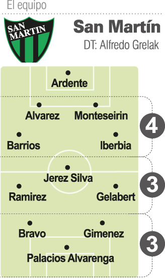 La formación inicial de San Martín arrancó con Luis Ardente en el arco; en la defensa, repitió el cuarteto de Rafael Barrios, Franciso Alvarez, Facundo Moteseirín y Raúl Iberbia. Luego, en el medio, paró a Ramírez por la derecha, Luis Jerez Silva por el centro y Marcos Gelabert por la izquierda y liberado. En tanto que en el ataque, el trío Martín Bravo, Pablo Palacios Alvarenga y Matías Gimenez volvió a tener titularidad en la práctica. Luego, Grelak comenzó a probar algunos cambios en el sistema, en el mediocampo especialmente, y también variantes de ataque pero nada quedó definido y por lo que tiene de trabajo encima, la primera alineación es la que corre con ventajas.