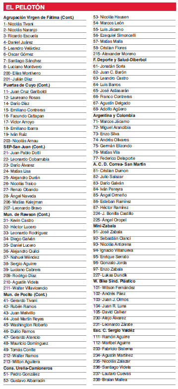 En ese mundo problemático y febril, como dice la letra de Cambalache, una docena de equipos apuesta por la vida. Por respirar el aire puro que golpea la cara cuando uno le pone el pecho a las mariposas. Unos con más recursos que otros, pero todos con la misma ilusión. Los cinco Continentales, ya conocidos, pensando en la "Vuelta a San Juan" como objetivo de máxima y los amateurs con el sueño más chiquito de ganar, al menos, una etapa. Antenoche se inscribieron las formaciones y se otorgaron los números a una docena de conjuntos. Del año pasado faltan la Fundación Emanuel Saldaño (es una de las dos que se sumarían para esta semana o la próxima) pero se agregó la Escuela de Ciclismo Sergio "Payasito" Valdez. Otro de los debutantes es el equipo conformado denominado Wilson Bike-Sindicato del Plástico. Quienes prolongaron su presencia son la Fundación Deporte y Salud-Diberbol, Construcciones Ureña-Camioneros de San Juan, Mini-Zabala, la Asociación Civil Deolinda Correa- San Martín y la fusión argentino-colombiana: Argycol. No hubo muchos cambios, el único rimbombante, si se quiere, por la trayectoria del protagonista, es el de Héctor "Willy" Lucero que dejó el SEP-San Juan y fichó por la Municipalidad de Rawson, equipo donde debutara a principios de siglo. Los de Facundo Cattapan y Víctor Arroyo a Puertas de Cuyo, viniendo de Rawson y Shania, respectivamente, junto a la incorporación, por parte del SEP del chubutense Nicolás