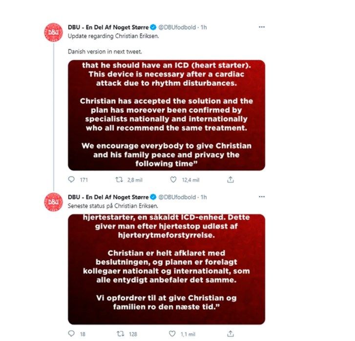 En las últimas horas, luego de que el propio futbolista publicó una foto en sus redes sociales y envió un mensaje desde la cama del centro donde es atendido, la Federación Danesa de Fútbol (DBU) emitió un comunicado en el que confirmó que Eriksen deberá ser operado del corazón y se le implantará un desfibrilador automático luego del incidente que sufrió el jugador del Inter en la cancha.