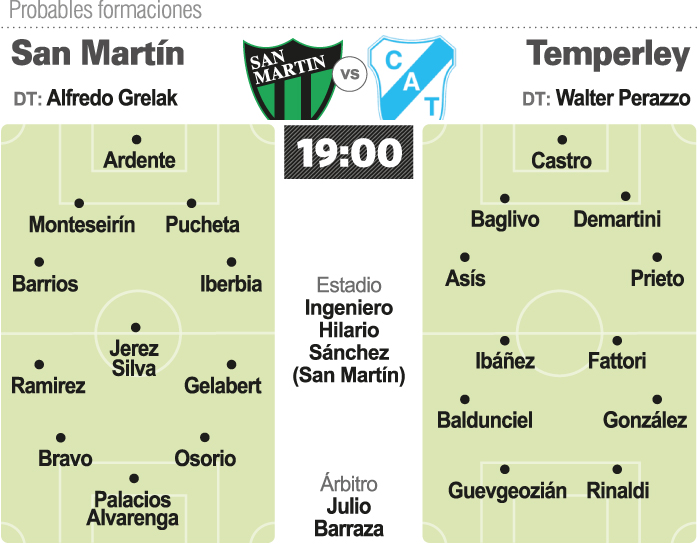 Así, este San Martín que aún no gana en San Juan pero que no ha perdido fuera de San Juan, ya empieza a salir de memoria con Ardente en el arco; Barrios, Monteseirín, Pucheta e Iberbia en la defensa; Ramírez, Jérez Silva, Gelabert en el mediocampo y arriba, Bravo más retrasado junto a Palacios Alvarenga y Osorio Botello. Esa es la apuesta de Grelak y hoy puede ser el gran día.
