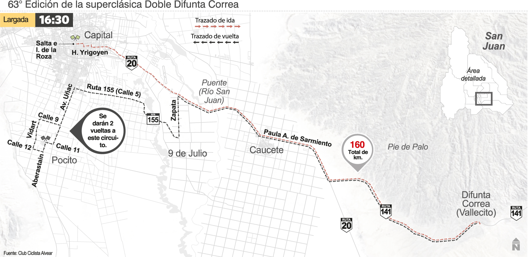 Hablar de la Difunta Correa es decir San Juan y también muchas otras cosas. Una de ellas es, sin dudas, mencionar al ciclismo, uno de los deportes que más pasiones despierta por estas latitudes. Es que el paraje en Vallecito es el destino elegido por pedaleros profesionales y aficionados en tiempos de entrenamientos. Hoy, desde las 16.30 se disputa la gran clásica que es la "Doble Difunta Correa’, con otra particularidad más como es que su epicentro no estará en 9 de Julio. A diferencia del 2018, en esta ocasión el Club Ciclista Alvear definió que se ponga en marcha en la Capital y luego de ir hasta el Santuario, el regreso y la finalización será en Pocito con un circuito veloz que se transitará en un par de ocasiones (ver infografía). Es el punto final del año para una temporada de Ruta que va tomando forma y que en enero recorrerá lo más atractivo, con la Vuelta a San Juan de foco principal. El historial de la Difunta marca que no es fácil repetir las alegrías. Un dato lo revela claramente: Ricardo Escuela es el único ciclista que la ganó dos veces desde el 2000 a la fecha. El barrealino se coronó en 2013 y 2015, siendo hoy la chance de concretar ese triplicado tan complejo. Se espera un pelotón más que nutrido por lo especial de la prueba y porque habrá presencias destacadas que la disputarán de manera individual. Un caso será el del mejor ciclista argentino: Maximiliano Richeze. El Atómico, flamante refuerzo del ultra poderoso "UEA Team Emirates’, afrontará el esfuerzo de 160 kilómetros como para ir tomando su mejor forma.
