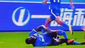 El senegalés Demba Ba, actualmente en el Shanghai Shenhua, se rompió la tibia y el peroné de la pierna derecha en una jugada muy desafortunada. Video.