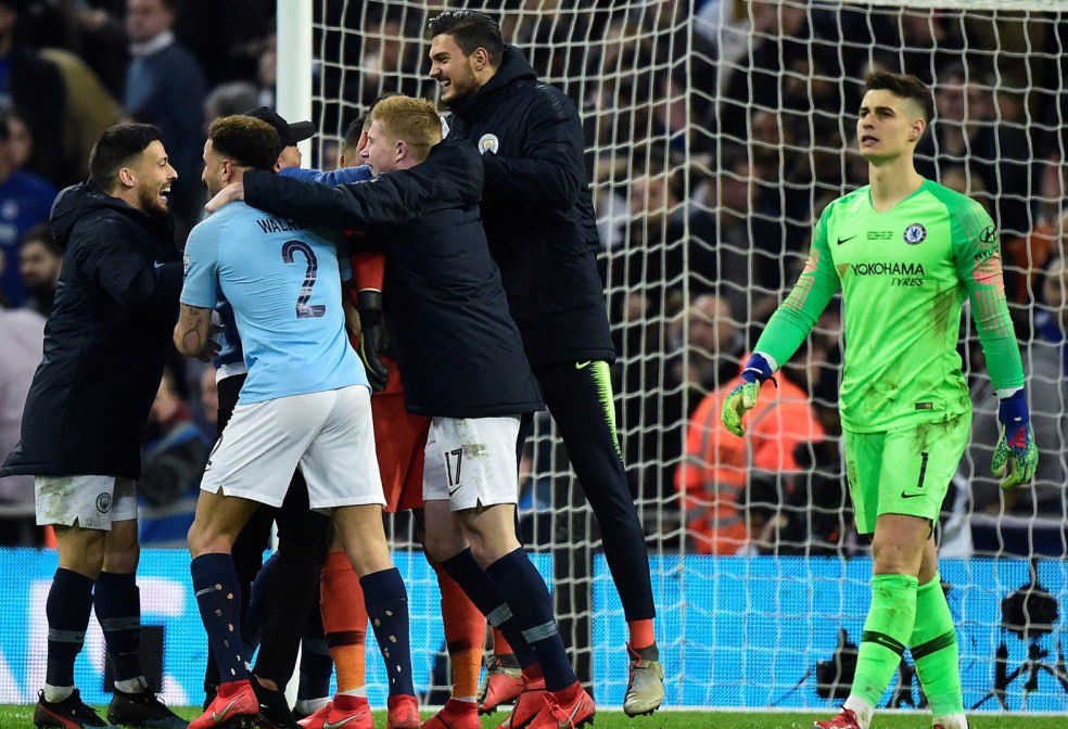 Cuando restaba un minuto para el final de la prórroga y el partido se encaminaba a los penales con el 0-0 en el marcador, el director técnico llamó al arquero suplente, el argentino Wilfredo Caballero, y le indicó que ingresase al terreno de juego en lugar de Kepa Arrizabalaga. El joven español que llegó al elenco inglés proveniente del Athletic de Bilbao había sufrido una molestia en una de sus piernas minutos antes, motivo por el cual el entrenador decidió no arriesgar en los penales y mandar a la cancha al experimentado argentino. Cuando el cuarto árbitro levantó el cartel indicando el cambio, Kepa estalló. Con gestos y gritos, el español le señaló al banco de los suplentes que se encontraba en perfecto estado y que no quería ser reemplazado. Mientras tanto, Sarri le contestaba con ademanes que no le interesaba lo que le dijera y que debía salir del campo cuanto antes. Los árbitros se miraban entre ellos y Caballero no podría entrar hasta que su compañero no saliese por su propia voluntad. El conflicto, que fue visto por todos los espectadores en Wembley y por millones de personas en el mundo, duró cerca de dos minutos.Finalmente, el partido continuó y Kepa defendió su arco durante la tanda de penales. El español le atajó el penal a Sané y casi le tapa el disparo al "Kun" Agüero.