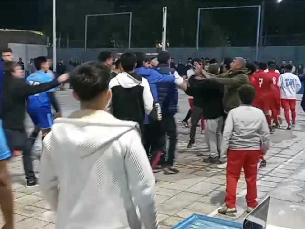 Los jugadores del equipo perjudicado, el cuerpo técnico y algunos simpatizantes se enfurecieron y comenzó una batahola que incluyó agresiones físicas, corridas, empujones y amenazas de parte de ambas parcialidades.