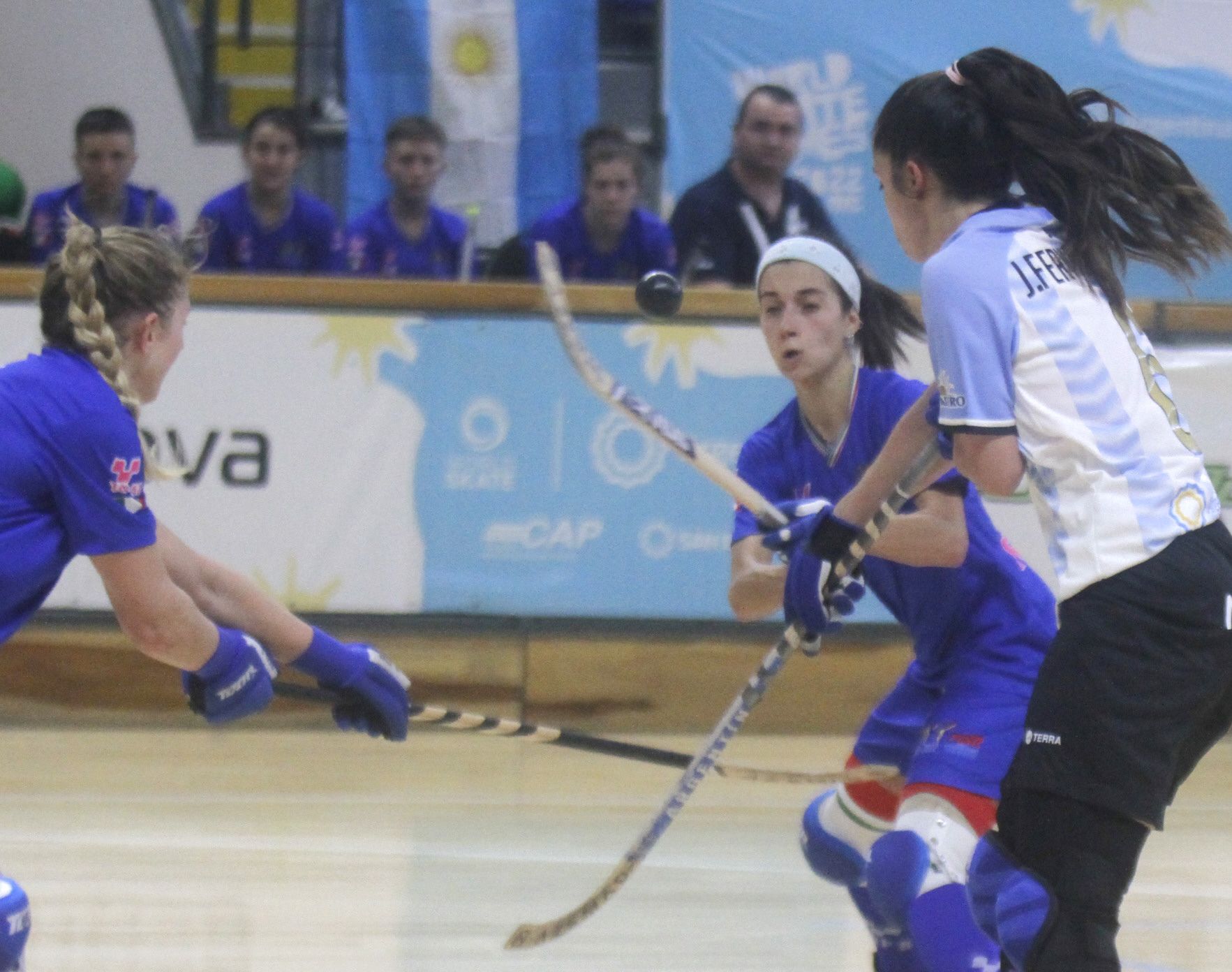 En el aire. La mendocina Julieta Fernández lucha por la posesión de la bocha ante dos jugadoras italianas. Argentina insistió y logró darlo vuelta.