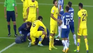 España, 10 de noviembre.- Impactante imagen la del arquero del equipo amarillo, Sergio Asenjo, que pudo continuar jugando pese a que cayó con toda la cabeza en el césped en posición vertical tras interceptar un balón en el aire.