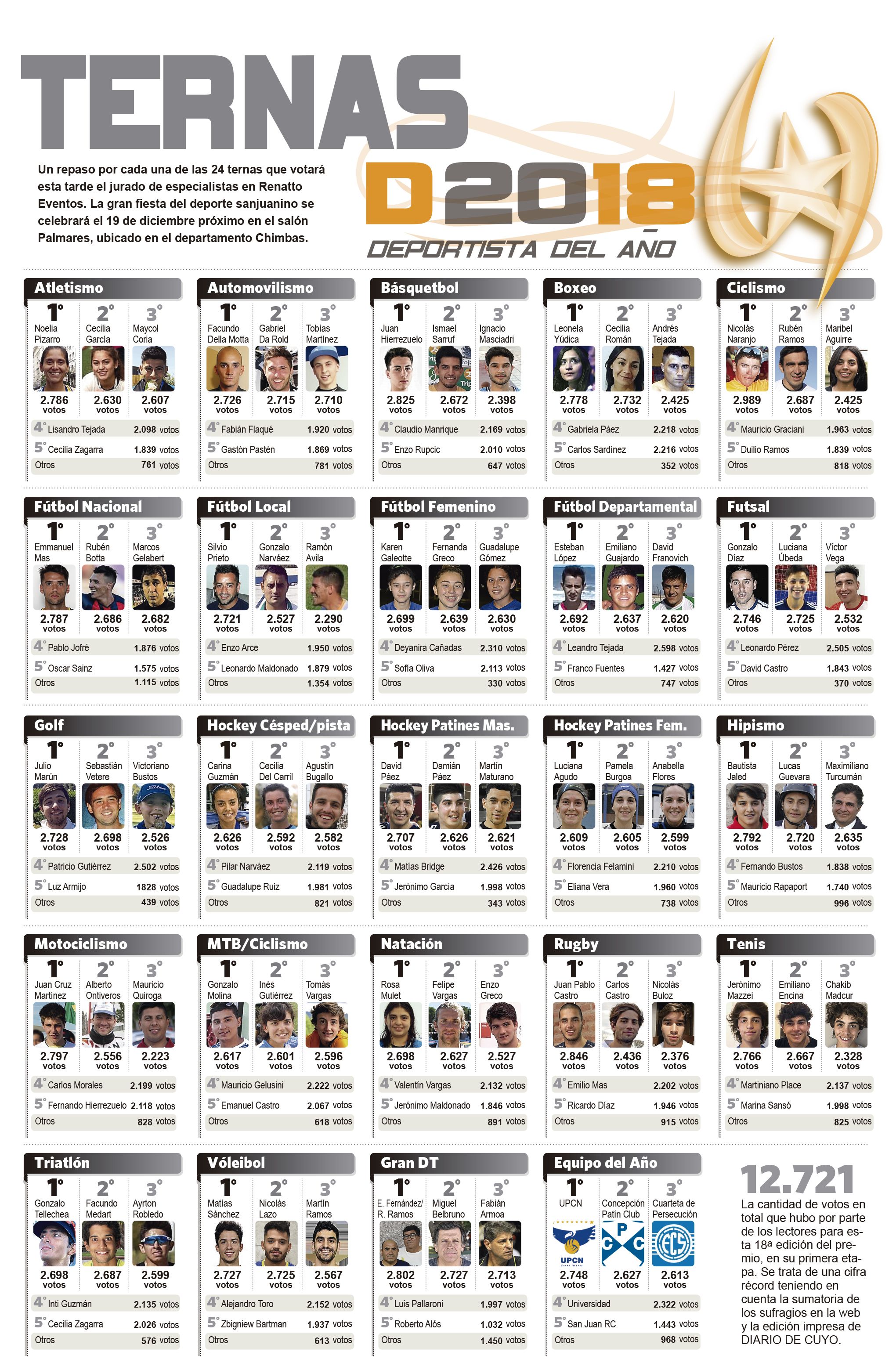 Las ternas de cada una de las disciplinas del Deportista del Año 2018 fue elegida por los lectores de DIARIO DE CUYO. Este año la participación del público fue récord: 12.721 entre aquellos que lo hicieron mediante la edición de papel y la página web .