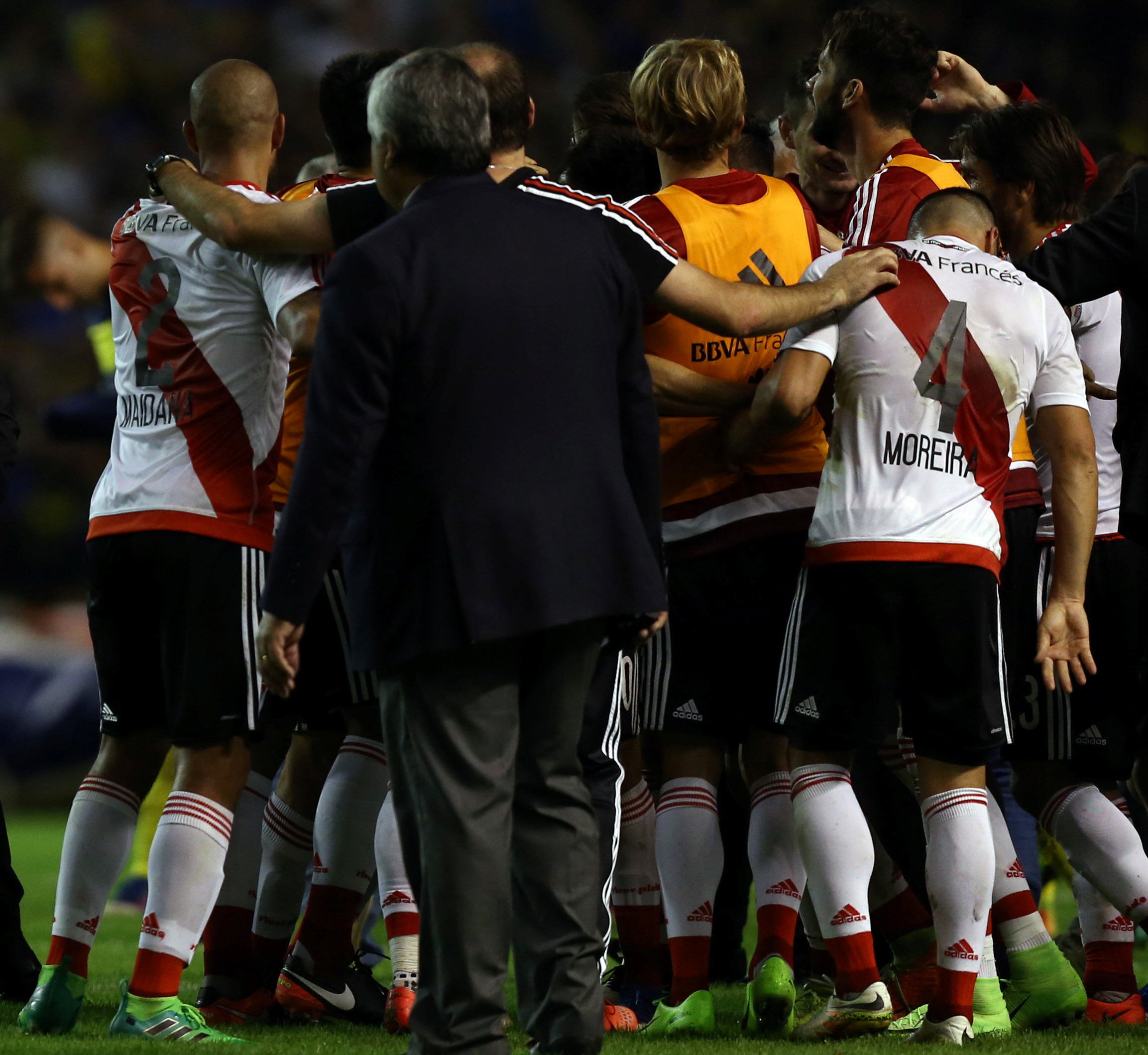 El plantel de River Plate fue recibido por cientos de hinchas eufóricos en su regreso al estadio Monumental tras la victoria clásica 3-1 sobre Boca en la Bombonera.