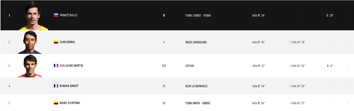 Tercero en la general se ubica el francés Guillaume Martin, que se ubica a 28 segundos del líder.