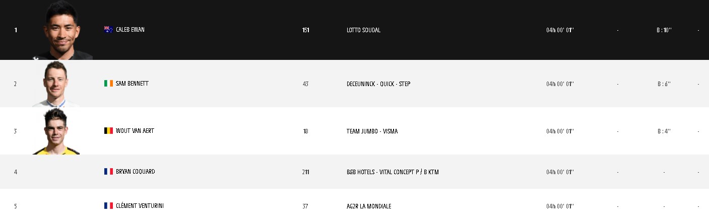 En el segundo lugar quedó el irlandés Sam Bennett, vencedor de la etapa precedente y quien subió una posición en la clasificación de un día al final del cual Roglic retuvo la casaca amarilla de líder de la clasificación general.