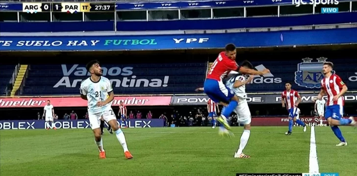 Corrían 28 minutos del primer tiempo cuando el ex volante de River saltó y cabeceó un balón que, a destiempo, fue a disputar Ángel Romero -autor del gol de Paraguay-. El delantero de San Lorenzo llegó tarde e impactó con sus rodillas en la espalda del hombre de Palacios, que terminó tendido y visiblemente dolorido, al punto que debió ser reemplazado por Giovani Lo Celso y llevado en el carro de los lesionados hasta el banco de suplentes.