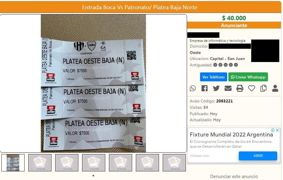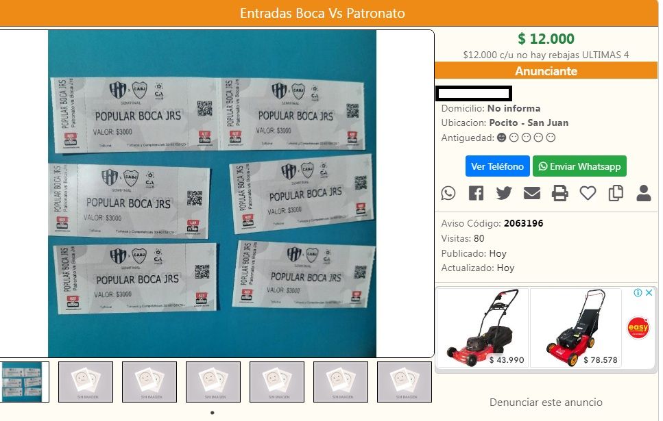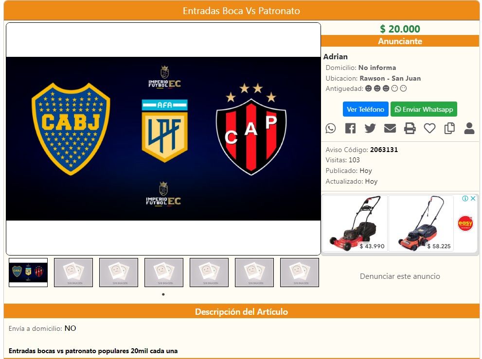 Por ejemplo, en una web dedicada a la compra-venta se ofrecen populares a $12.000, es decir, cuatro veces más que el costo oficial de $3.000. También hay ofertas por $8.000 y hay un vendedor que pide $20.000 por cada ticket.