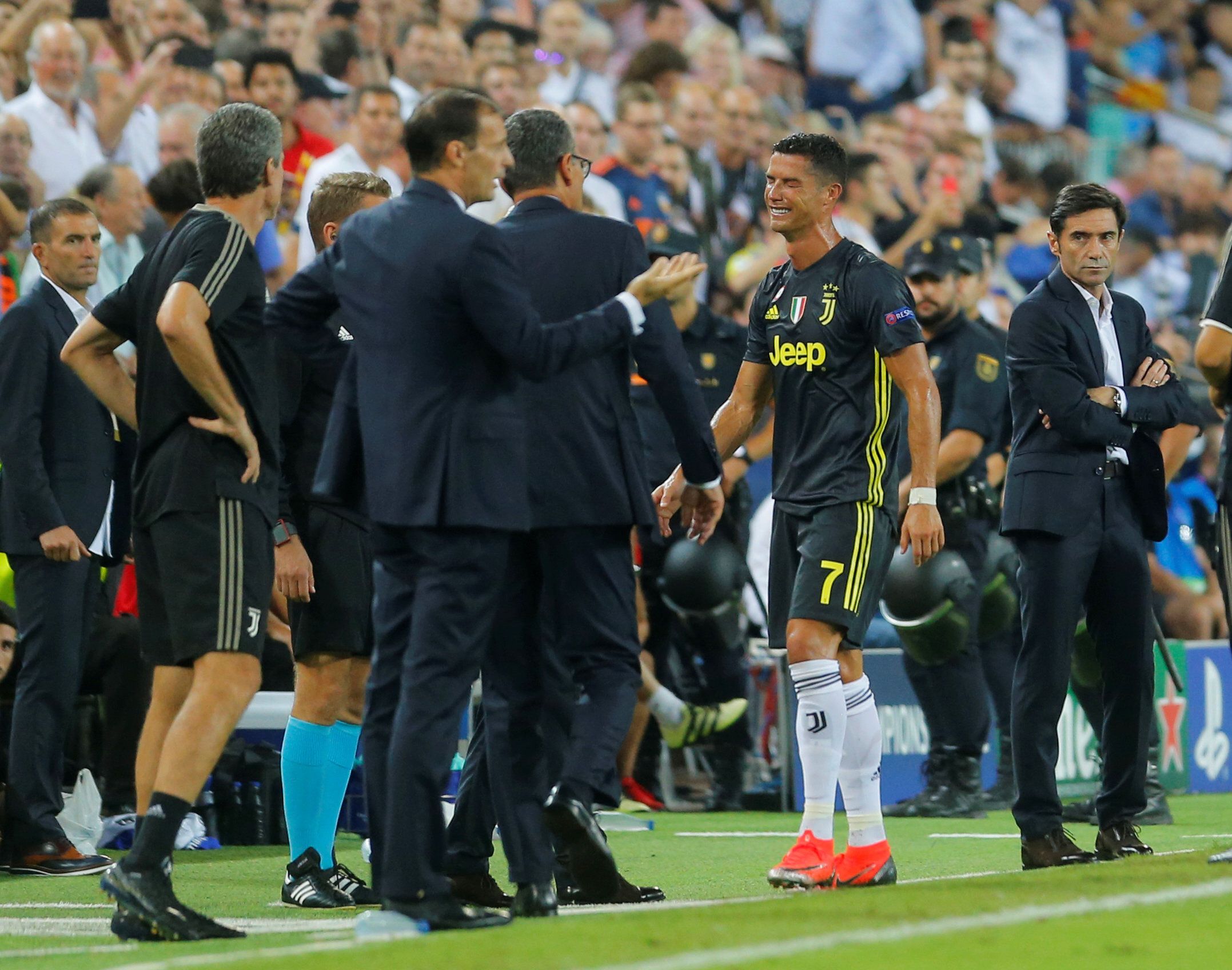 El entrenador de la Juventus de Turín, Massimiliano Allegri, se mostró "satisfecho" tras la victoria de su equipo en Mestalla (0-2) en la primera jornada de la fase de grupos de la Liga de Campeones, pero lamentó la expulsión de Cristiano Ronaldo a la media hora del encuentro porque si hubiese VAR en la Champions "habría ayudado al árbitro" para no sacarle la tarjeta roja. "La expulsión es injusta. Estoy convencido de que el VAR hoy habría ayudado al árbitro en la expulsión de Cristiano Ronaldo. Con las imágenes se hubiese evitado", expresó el técnico de la entidad italiana en la conferencia de prensa posterior al partido.