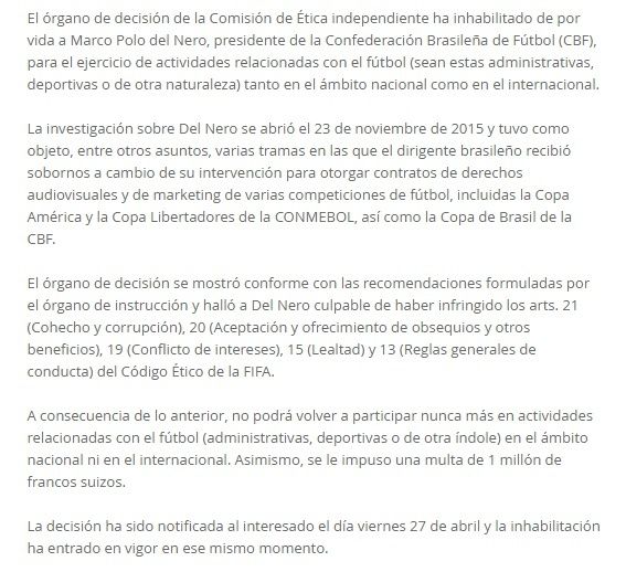 Marco Polo Del Nero, el presidente de la Confederación Brasileña de Fútbol (CBF), fue "suspendido de por vida de toda actividad ligada al fútbol" debido a hechos de corrupción, según lo anunció la FIFA a través de un comunicado.