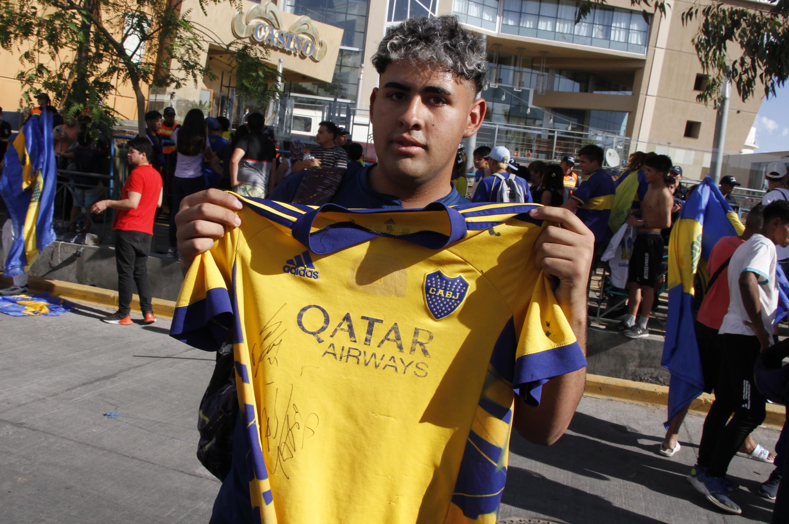 Agustín Castro es otro hincha de Boca que llegó desde Rawson para estar desde temprano en las cercanías del hotel capitalino para aguardar la llegada del club de sus amores. El chico estuvo cerca del vallado y logró que el futbolista del momento, Agustín Rossi, le firme la camiseta y también la funda del celular.  "Agustín es mi ídolo, el mejor arquero que podemos tener", contó. El chico no logró conseguir entradas pero aseguró que "de alguna manera voy a estar".